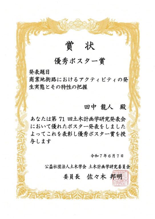 当研究室の田中龍人が土木計画学研究発表会優秀ポスター賞を受賞しました。